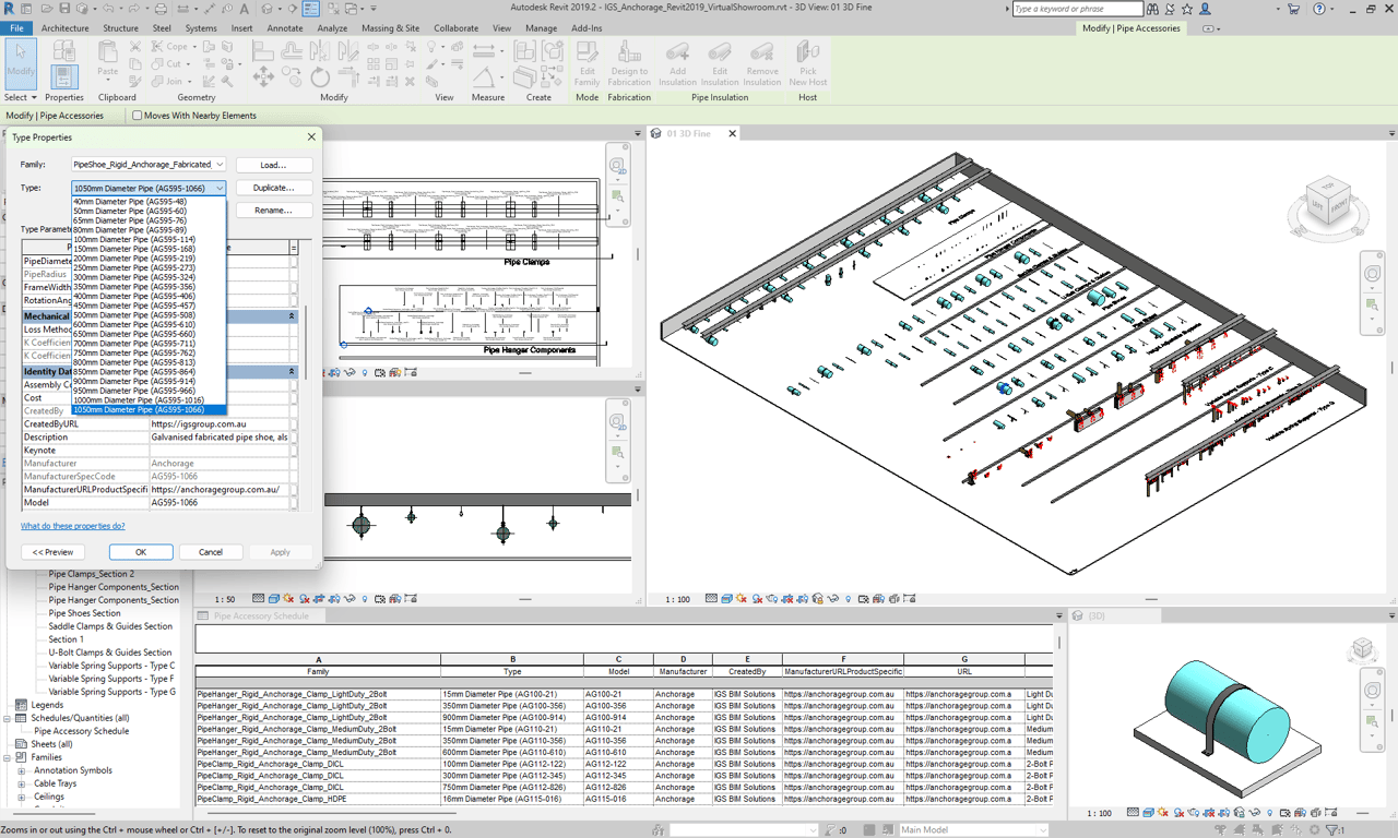 A Revit project file (.RVT) with families / types laid out for efficient browsing and preformatted for QA of content 2D / 3D views and family data.