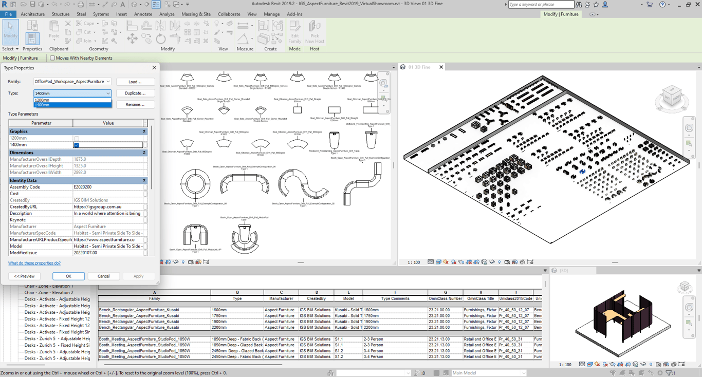 Aspect Furniture Revit families have been created to a consistent, high standard with the objective of finding a balance between complexity of use, functionality, documentation output, file size and performance in a Revit project environment