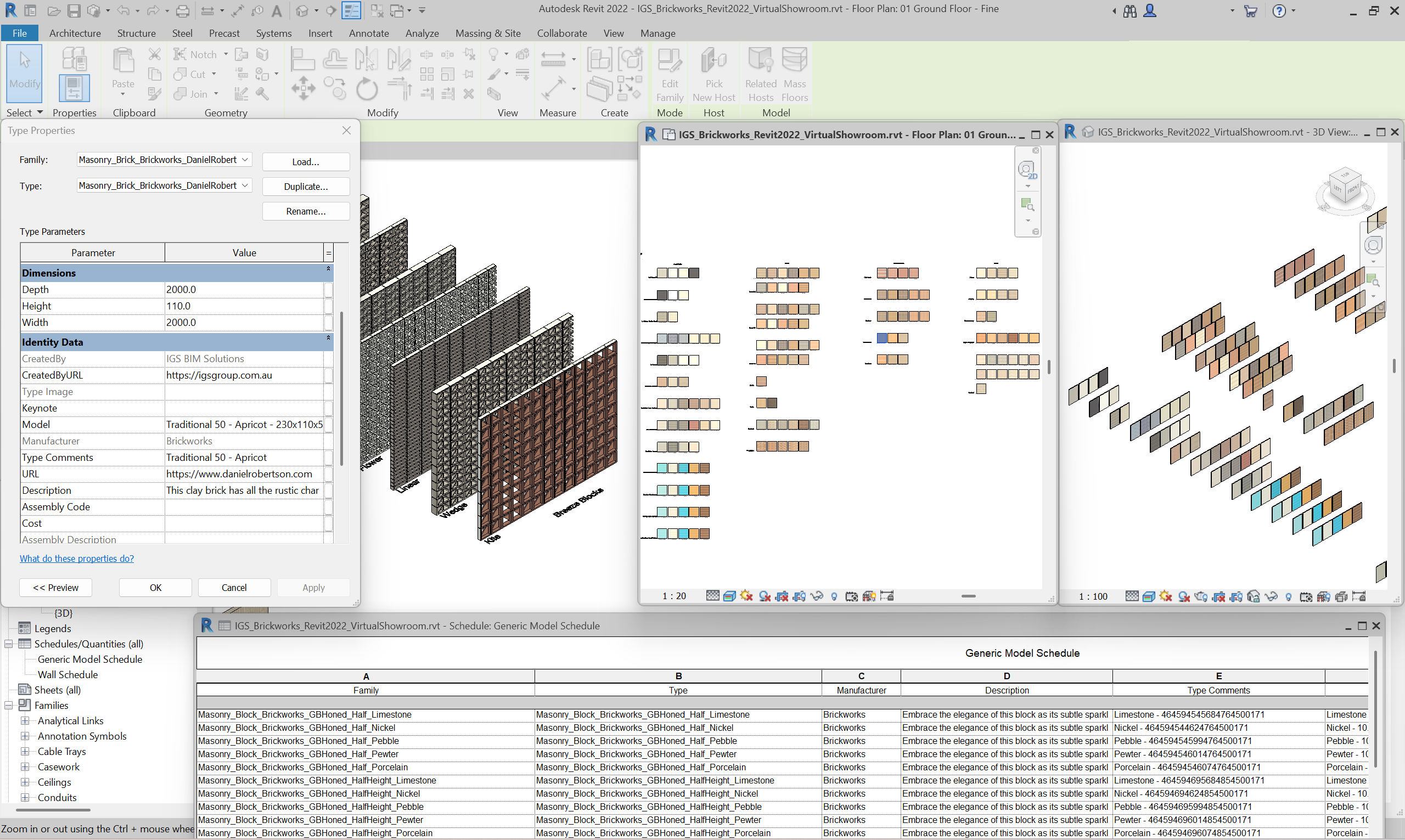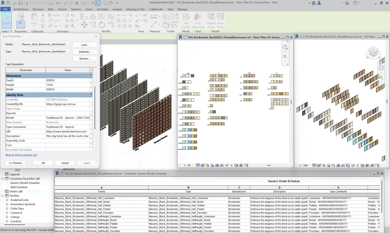 Brickworks Revit families have been created to a consistent, high standard with the objective of finding a balance between complexity of use, functionality, documentation output, file size and performance in a Revit project environment