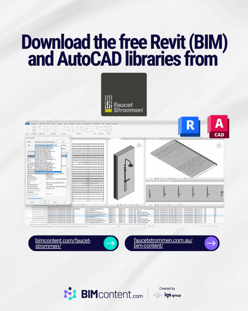 To browse and download the updated library, visit https://faucetstrommen.com.au/bim-content/ or BIMcontent.com.