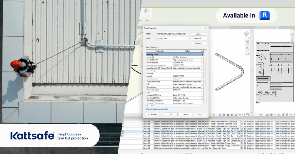Developed by BIM Content Creation specialists, IGS Group (IGS BIM Solutions), the Kattsafe Australia Revit library now includes over 120 Revit families across 11 product categories. These include Anchor Points, Davits and Needles, Fold-Down Ladders, Guardrails and Walkways, Platforms and Stairs, Rigid Rails, Roof Access Hatches, Skylight Protectors, Static Lines, Step Ladders, and Rung Ladders.